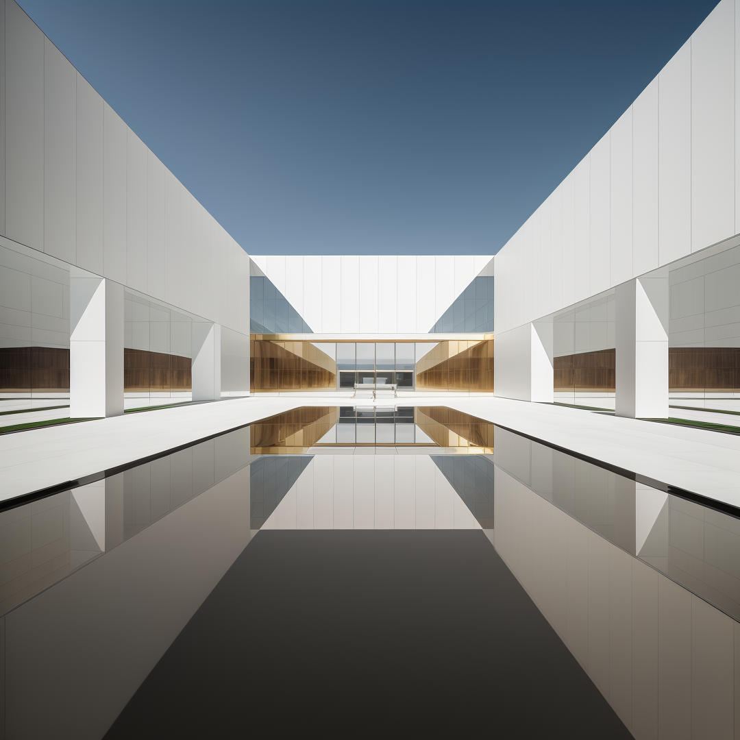 Generated by Image generation Gen-2 prompt: public building, realistic photo,modern style,museum, reflect glass, light, dramatic shadow, day time, landscape, pure white |