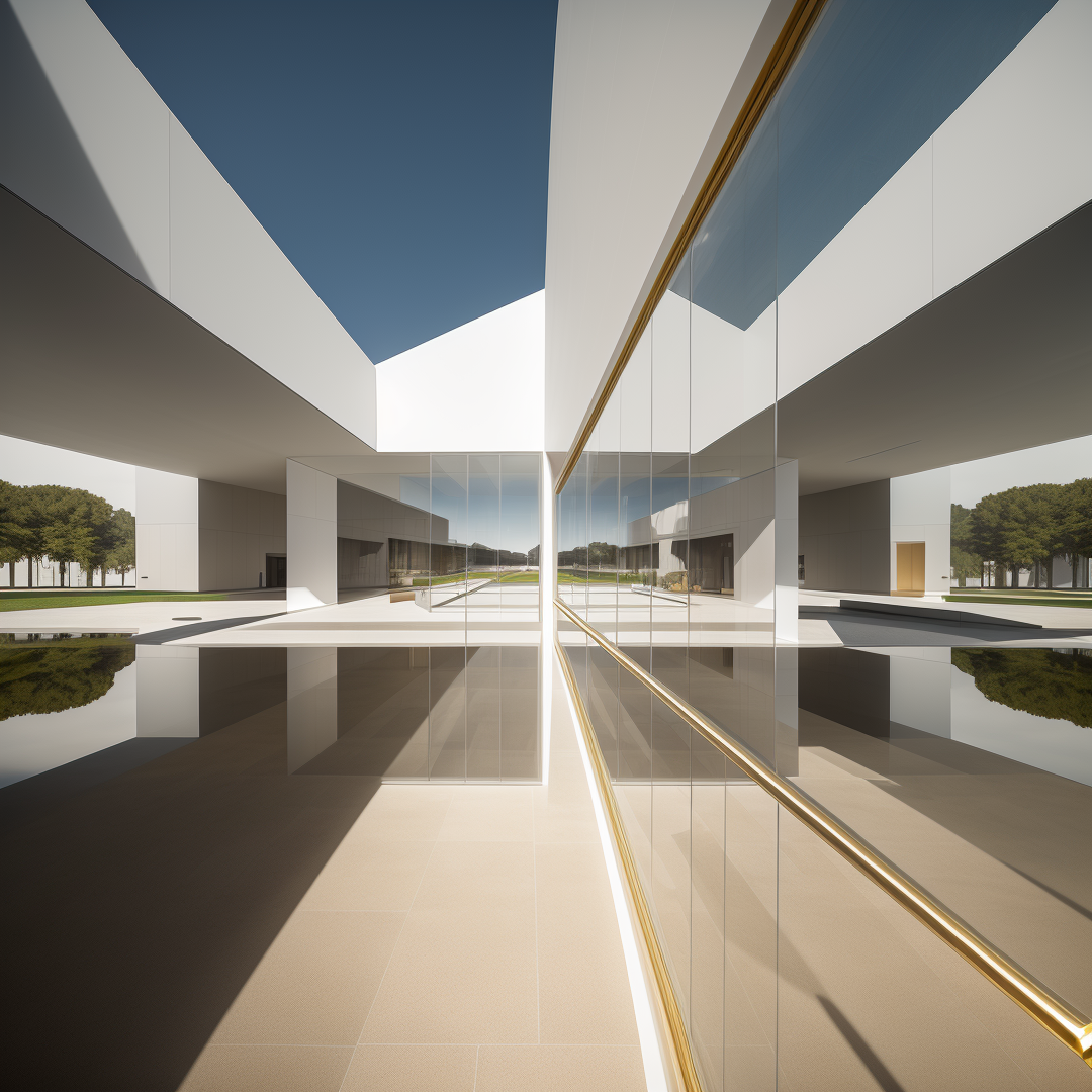 Generated by Image generation Gen-1 prompt: public building, realistic photo,modern style,museum, reflect glass, light, dramatic shadow, day time, landscape, pure white, gold |