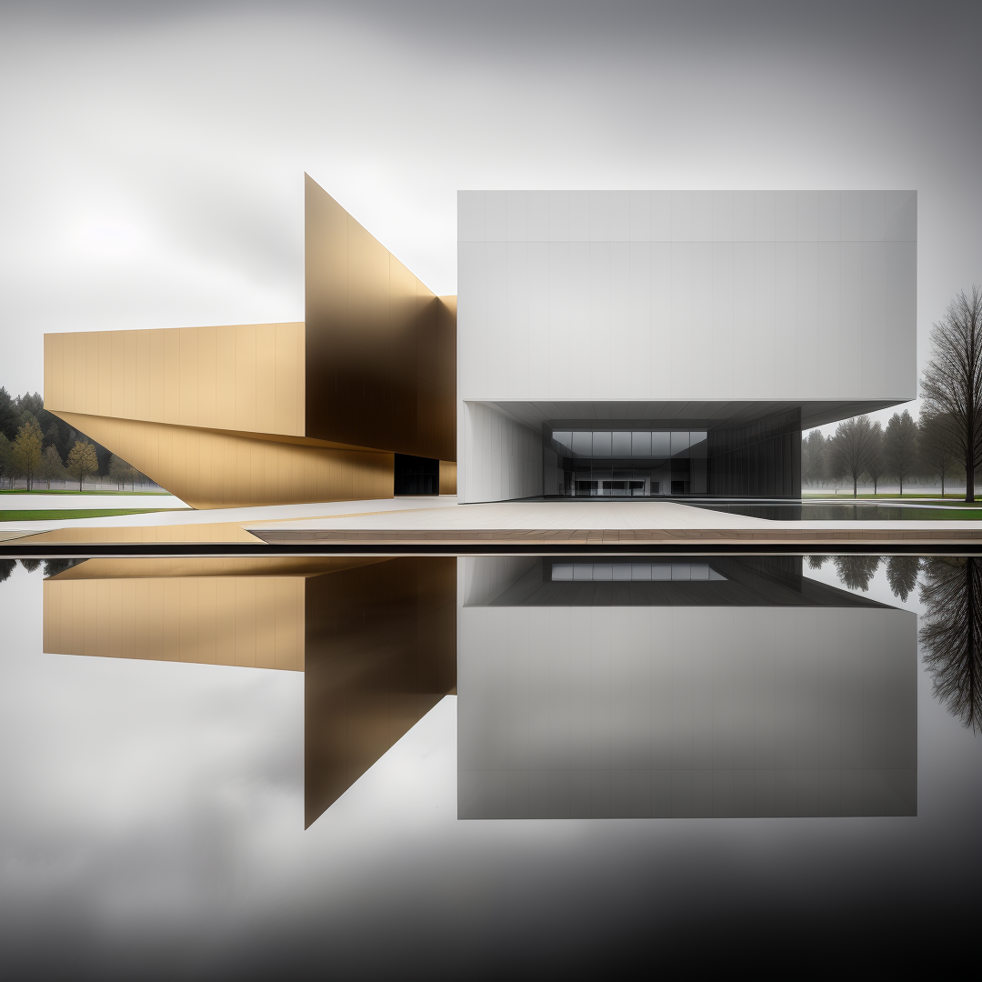 Generated by Image generation Gen-2 prompt: public building, realistic photo,modern style,museum, reflect glass, light, dramatic shadow, day time, landscape, pure white, gold |