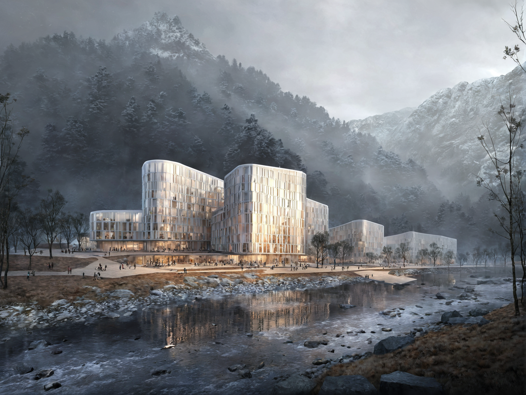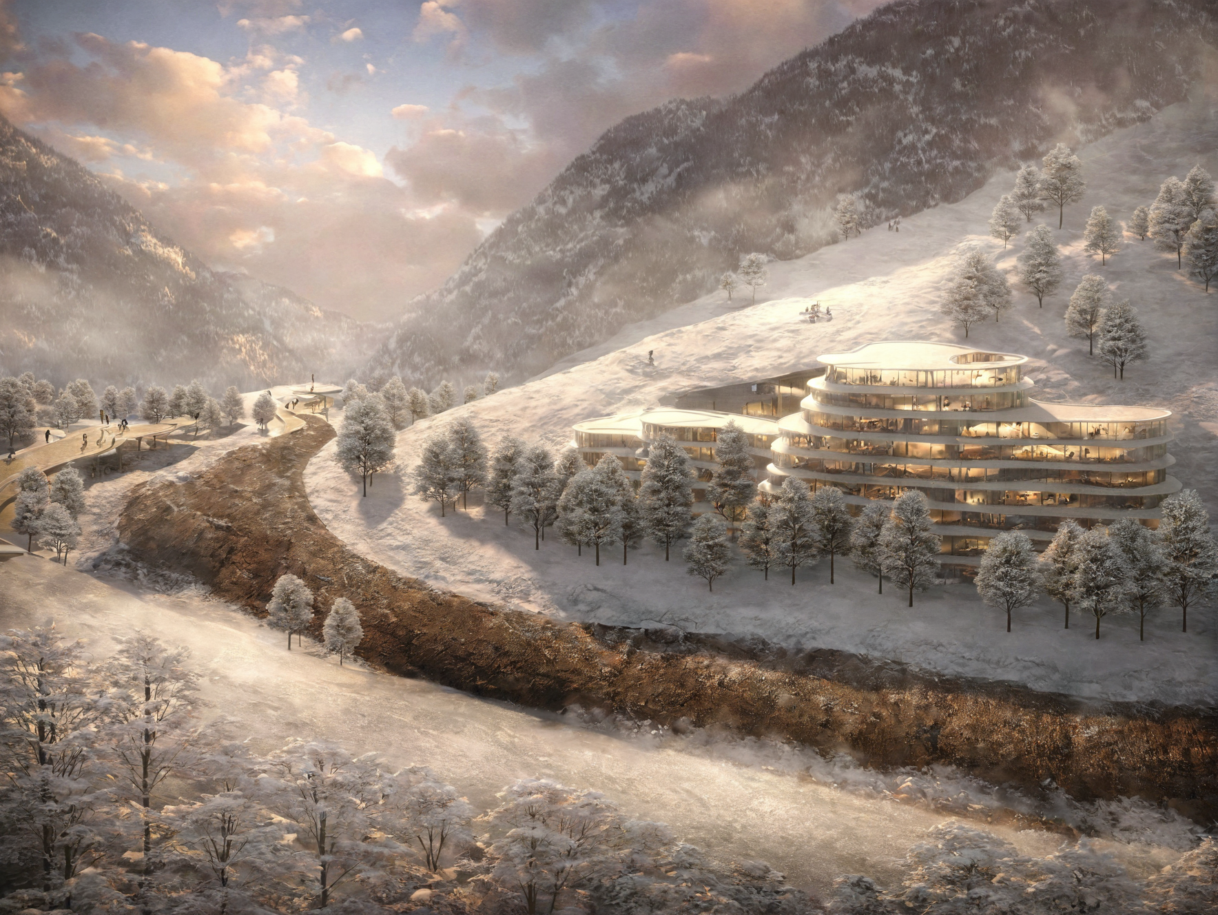 Control By Composition - Gen-2 prompt: public building, curved, mountain, river, calm, winter |