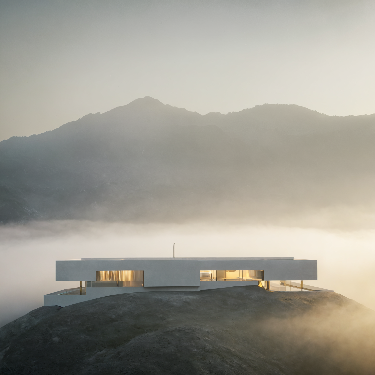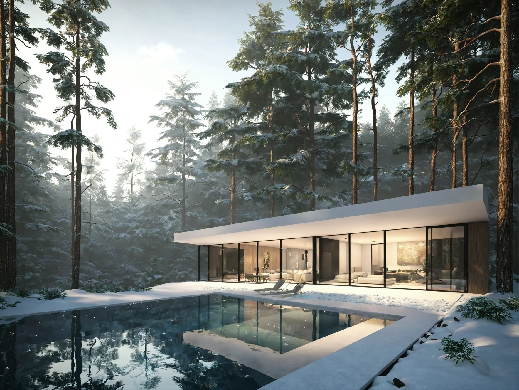 Generated by Image generation Gen-1 prompt: public building, realistic photo,modern style,museum, reflect glass, light, dramatic shadow, day time, landscape, pure white, rain, fog |