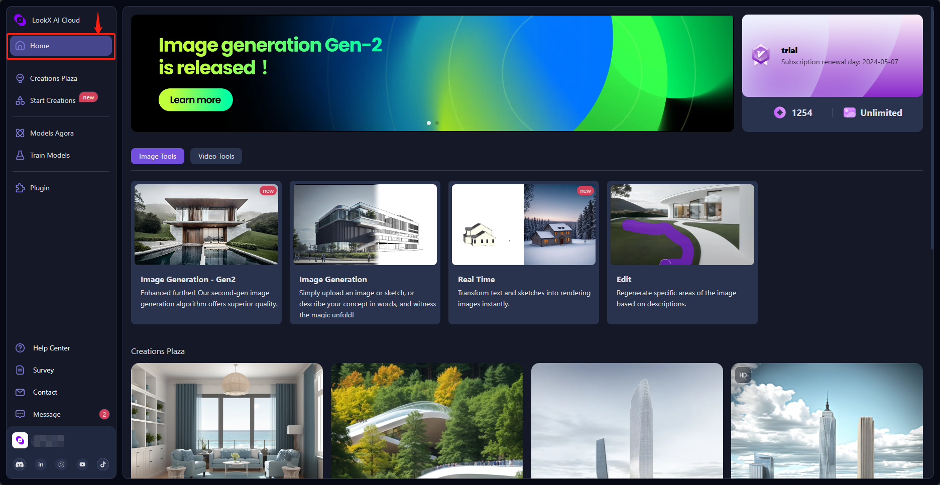A new personalized home page layout, which includes announcements, quick access to the generation feature, and a curated selection from our Inspiration Plaza.